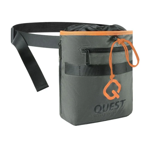 Finds bag in original Quest grey made from waterproof material to store all your finds. It has a large drawstring compartment, a zip pocket on the front and a zip pocket on the side. The strap is adjustable and easy to open and close. At the front of the bag is a strap to which you can attach your holster for your pinpointer