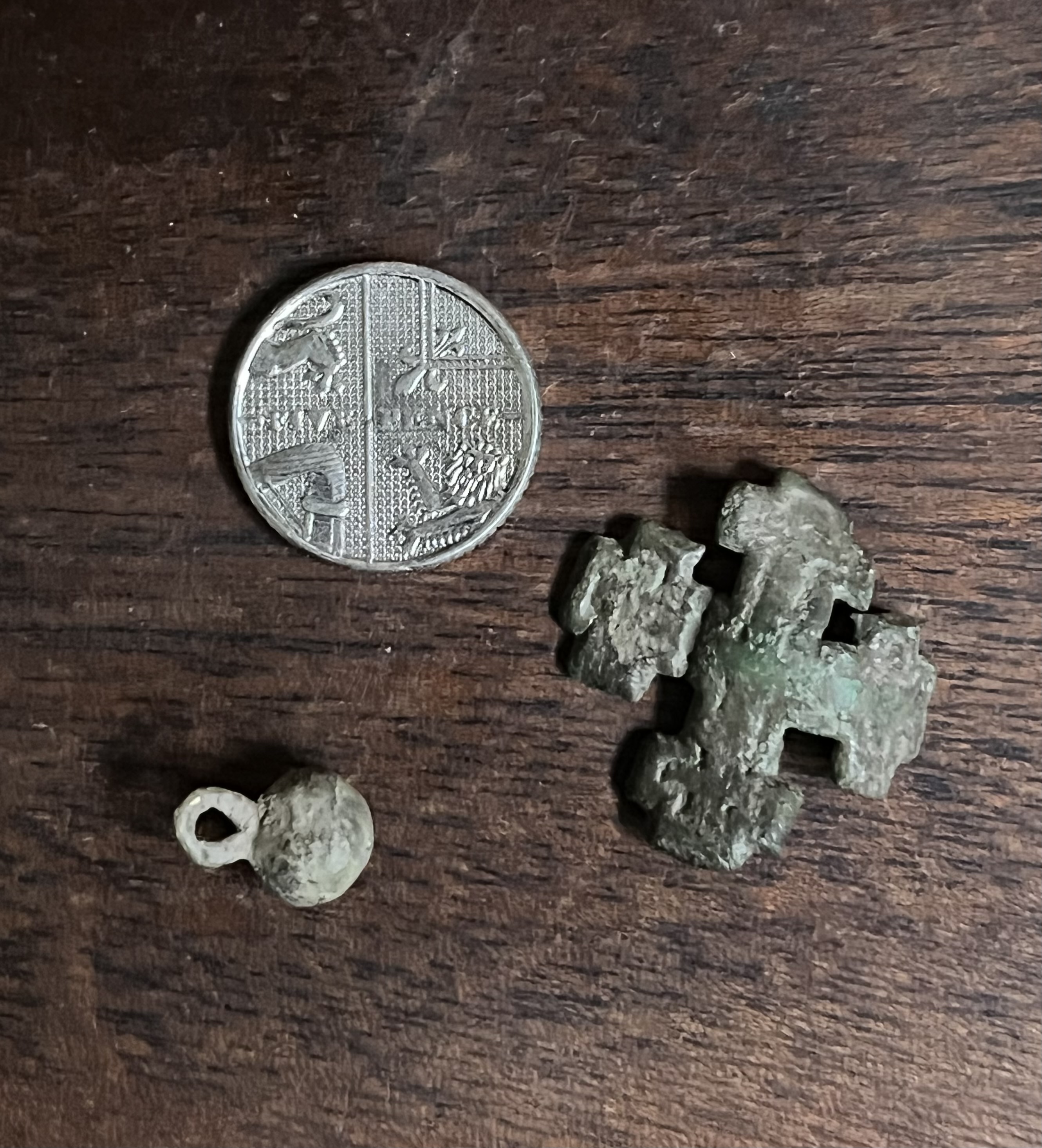 It was an uncomfortably hot day but I hadn't been out for a while. The field I was on was recently harvested leaving that bristly stubble behind. Didn't find much but it was good to be out. A few buttons, a watch winder, a cross shaped mount, a spoon handle  and a tiny decorative button of some sort.