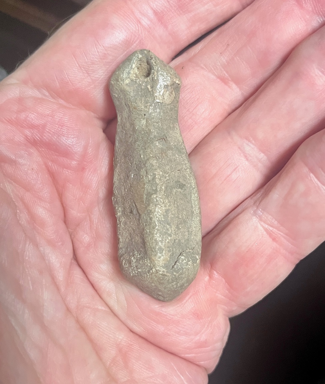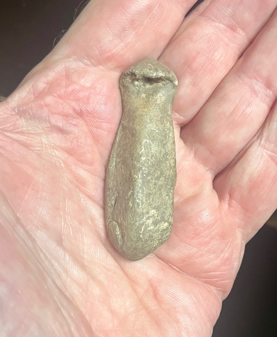 I recently found this lead weight. It is roughly teardrop shaped with broader base and slimmer top and is about 55mm in length. It has four sides to it, two to the front and two to the back. The top has a hole through it and is folded over slightly like a hood. I was thinking maybe it was either a fishing weight or maybe an elongated loom weight. Anyone out there got any thoughts?